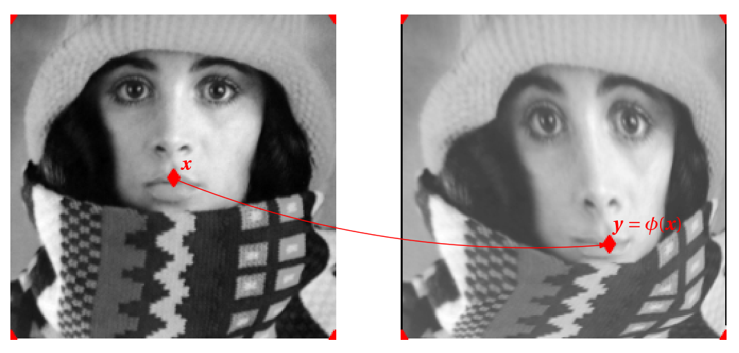 Fig. 4.1 Geometrical Operation. All points with their gray value (color value) in the image are put in a different spot. Indicated in the figure is that point \(\v x\) in the input image is ‘warped’ to position \(\v y =\phi(\v x)\) in the output image.
