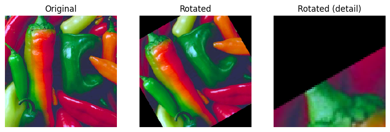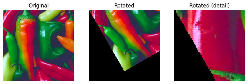 14plt.subplot(133); plt.imshow(c[:64,:64]); plt.title('Rotated (detail)')
