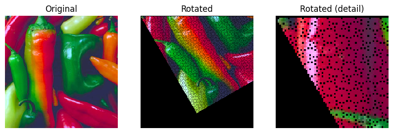 As can be clearly seen in this example the backward algorithm is the simplest one that really works. No more holes. Please note that we use a simple nearest neighbor interpolation. In practice it is much better to use a better interpolation scheme. Most image processing packages allow you to select one of several interpolation techniques.