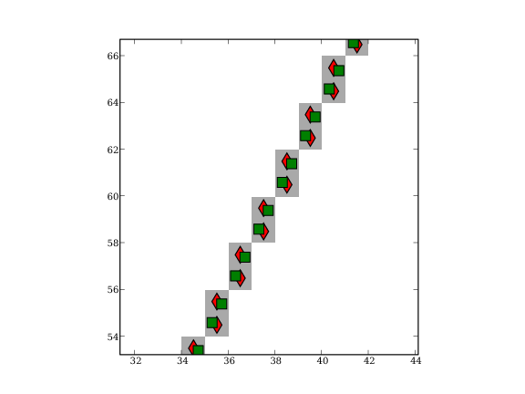 Fig. 6.26 Subpixel Accurate Line Detection. The red diamonds indicatie the grid points selected by the line detector. The green squares indicate the subpixel line positions.