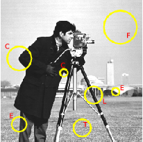 Fig. 6.2 Local Structure in images. In an image we distinguish several types of local structure like constant patches (F), edges (E), lines (L), corners (C) etc.