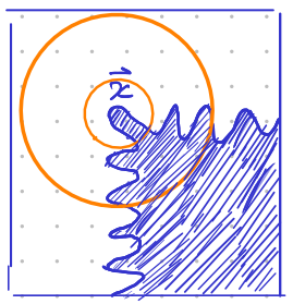 In fact at one point \(\v x\) in an image we may find different types of details at different scales (sizes). A constructed example is given in Fig. 6.3. At location \(\v x\) at small scale we ‘see’ the ending of a line whereas at larger scale the point \(\v x\) is a corner point. The fact that different types of details at different scales may be present at the same location can be seen in practice as well for instance when using the SIFT blob detector in scale space.