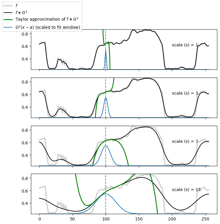 Observe in Fig. 6.9 that the Taylor approximation around \(a\) is close to the function \(f\ast G^s\) and the region in which the approximation is close is proportional with the scale \(s\). The scale of the Gaussian convolution thus indeed selects a scale that is proportional to the size of the neighborhood in which the local structure is characterized.