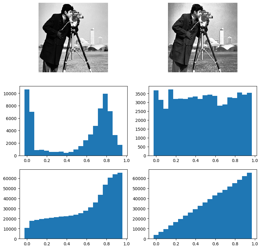 Fig. 3.8 Histogram Equalization. In the first column from top to botton: the original image, its histogram and its cumulative histogram. In the second column the histogram equalized version of the image with its histogram and cumulative histogram.