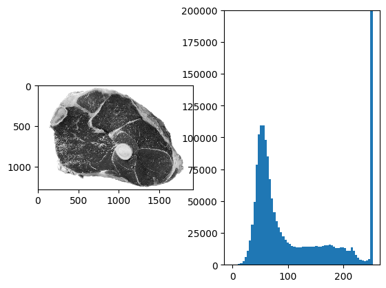 1from ipcv.utils.files import ipcv_image_path 2 3f = plt.imread(ipcv_image_path('meat2.jpg'))[:,:,1]; 4plt.subplot(121); plt.imshow(f); 5h, be = np.histogram(f, bins=64); 6plt.subplot(122); 7plt.bar(be[:-1], h, width=be[1]-be[0]); 8plt.ylim([0,200000]) 9