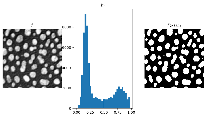 Fig. 3.9 Thresholding. On the left an image showing particles embedded in a substrate, the particles are brighter (whiter) than the background. This is also clearly visible in the histogram (center plot). On the right the thresholded image is shown. The threshold value is manually selected at \(t=0.5\).